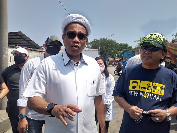 TEGAL BARAT, AYOTEGAL.COM- Tenaga Ahli Utama Kedeputian IV bidang Komunikasi Politik dan Diseminasi Informasi Kantor Staf Presiden (KSP), Ali Mochtar Ngabalin melakukan kunjungan kerja ke Kota Tegal, Minggu (9/8/2020). Dalam kunjungannya, ia mendatangi beberapa tempat, satu di antaranya kompleks Pelabuhan Jongor, Kelurahan Tegalsari, Kota Tegal. Di situ, Ali Ngabalin yang didampingi Wakil Wali Kota Tegal Muhamad Jumadi secara langsung bercengkrama dengan para nelayan Kota Tegal.