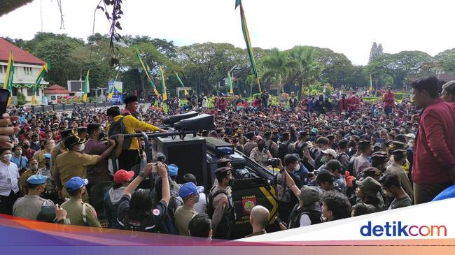 Ratusan mahasiswa di Malang Raya menggelar demo di depan DPRD kota setempat. Ada 25 tuntutan yang disampaikan mahasiswa dari gabungan Badan Eksekutif Mahasiswa (BEM) Malang Raya ini.